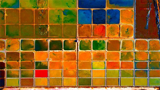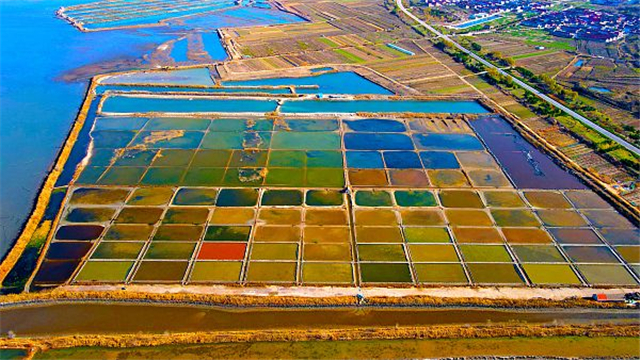 ??????2022年11月17日,俯瞰山東省榮成市港西鎮(zhèn)海邊的一處色彩豐富的鹽田。