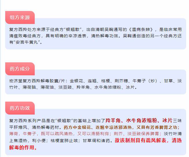 ??????在被推薦的五種藥品中,復(fù)方西羚解毒膠囊處方源自稱為清代名醫(yī)吳鞠通的"溫病第一方""銀翹散”,具有清熱解毒、辟穢化濁之功效。在“銀翹散”的基礎(chǔ)上,又增加了羚羊角、水牛角濃縮粉和冰片、復(fù)方西羚解毒膠囊,此前已多次入選多個(gè)版本《山東省新型冠狀病毒感染的肺炎中醫(yī)藥診療方案》推薦用藥。