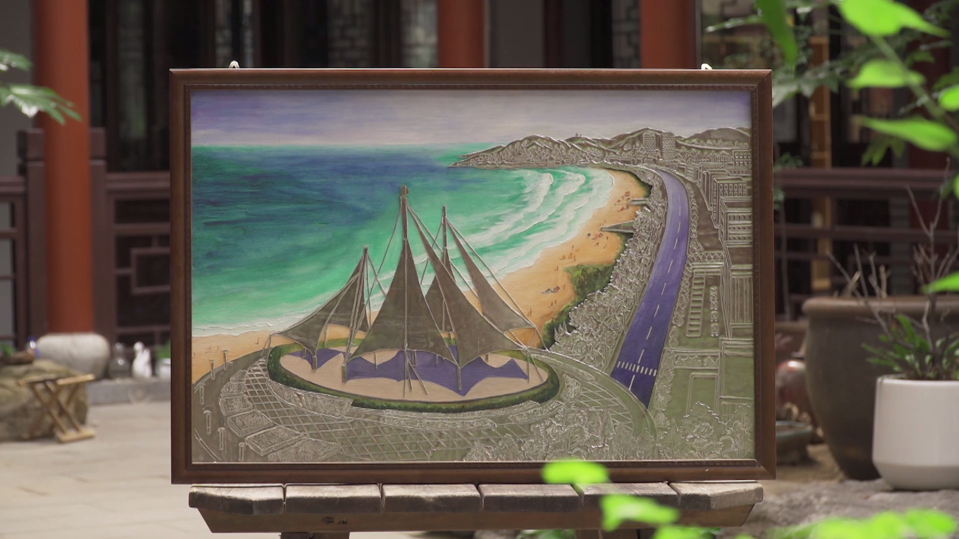 ??????讓我們跟隨鏡頭,一起欣賞這幅具有威海特色的錫鑲畫作《海水浴場(chǎng)》……
