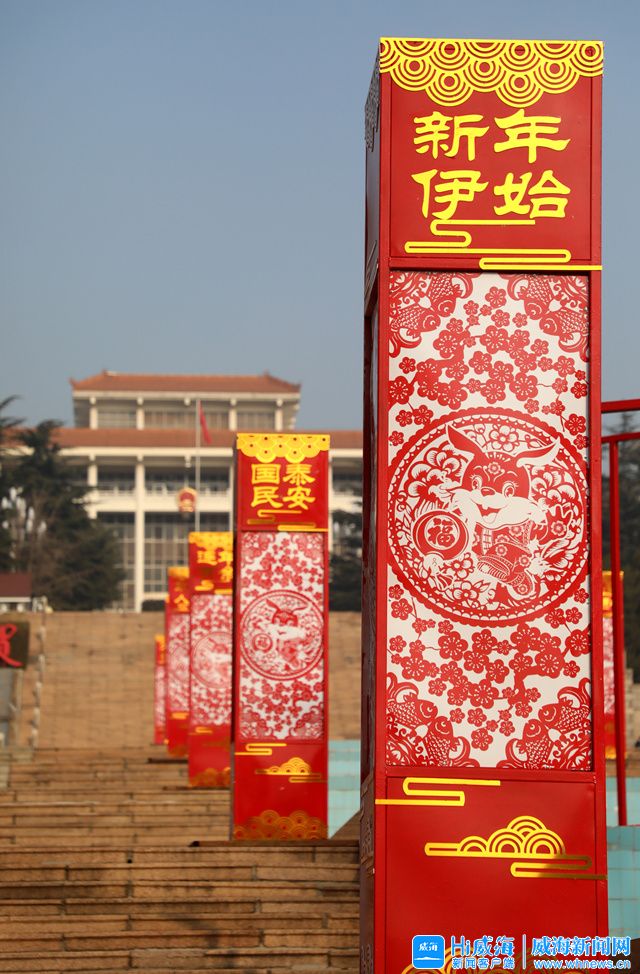 ??????春節臨近,威海市園林部門工作人員開始布置市人民廣場立體景觀,營造喜慶的節日氛圍。