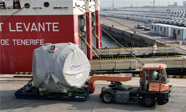 ??????煙臺港開辟“煙臺-歐洲”風(fēng)電設(shè)備滾裝班輪新航線,風(fēng)電設(shè)備從港口登上滾裝船駛往歐洲。(受訪單位供圖)