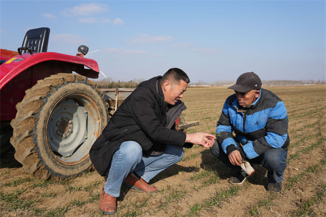 ??????↑ 2月15日,山東省威海市文登區金農會農業專業合作社負責人于進海(左)和農機手查看返青麥苗。
