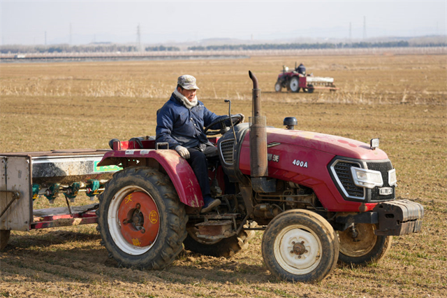 ??????↑ 2月15日,山東省威海市文登區金農會農業專業合作社農機手在為麥地追肥。