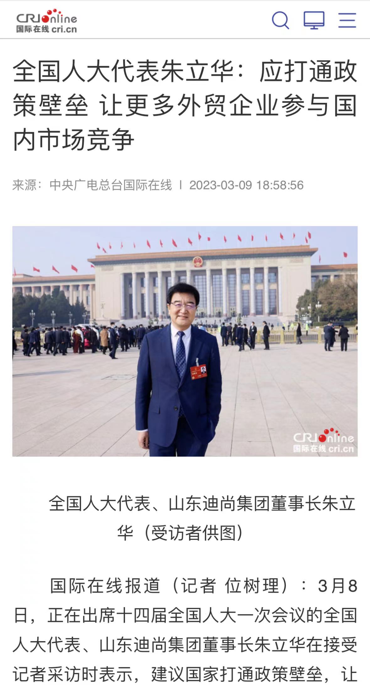 ??????3月9日,央廣國際在線刊發《全國人大代表朱立華:應打通政策壁壘 讓更多外貿企業參與國內市場競爭》,以下為報道全文:
