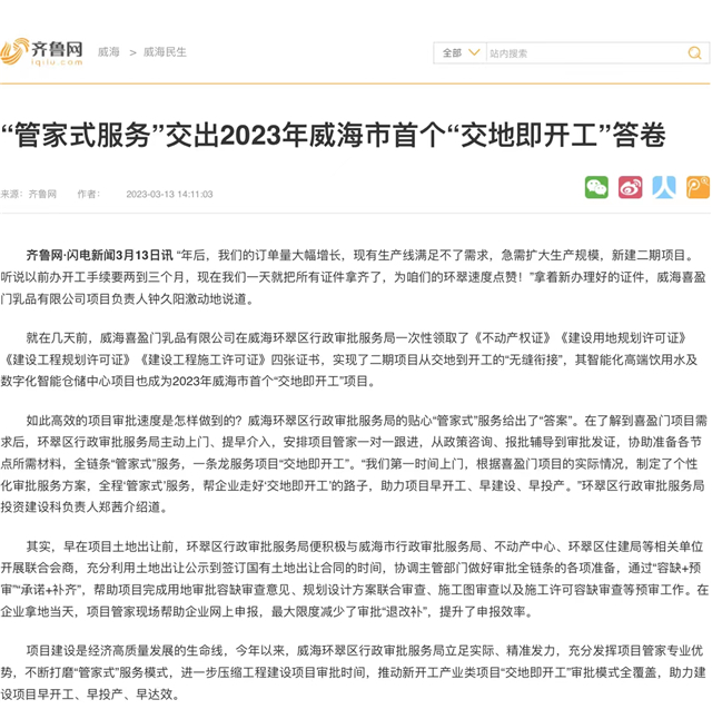 3月13日,齊魯網發布《“管家式服務”交出2023年威海市首個“交地即開工”答卷》,報道威海環翠區行政審批局“管家式”服務模式的經驗和做法。以下為報道全文——