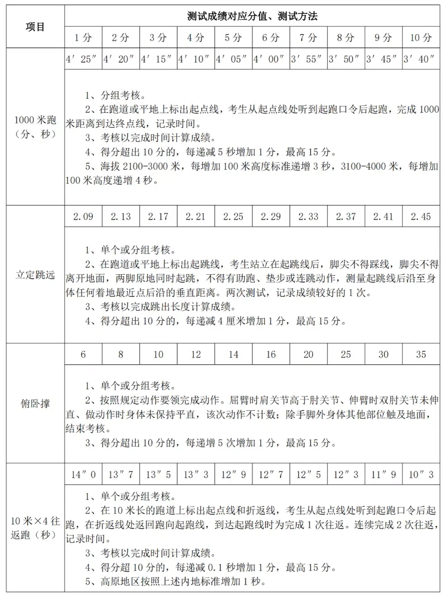 ??????體能測試標準參照《國家綜合性消防救援隊伍消防員招錄體能測試、崗位適應性測試項目及標準》執行。考核項目為:10米×4往返跑、1000米跑、俯臥撐、立定跳遠。