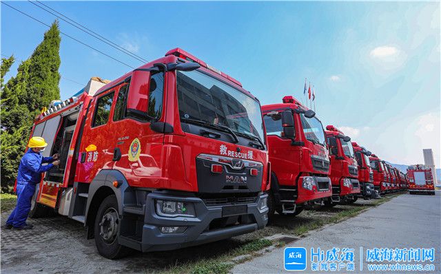 在威海廣泰特種車輛有限公司廠區內,工作人員正在檢查即將發往全國各地的消防車輛。