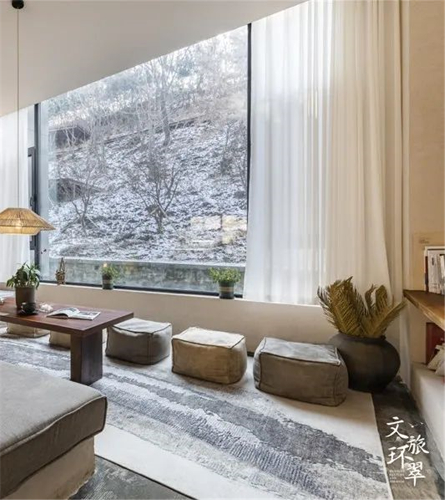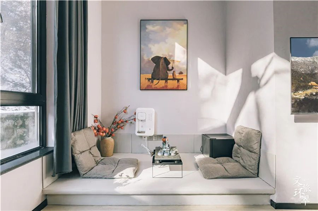 ??????民宿內(nèi)還設有波西米亞風的落地窗陽臺,可以邊敲打手鼓,邊欣賞山中景致,感受音符在山野中的回響。