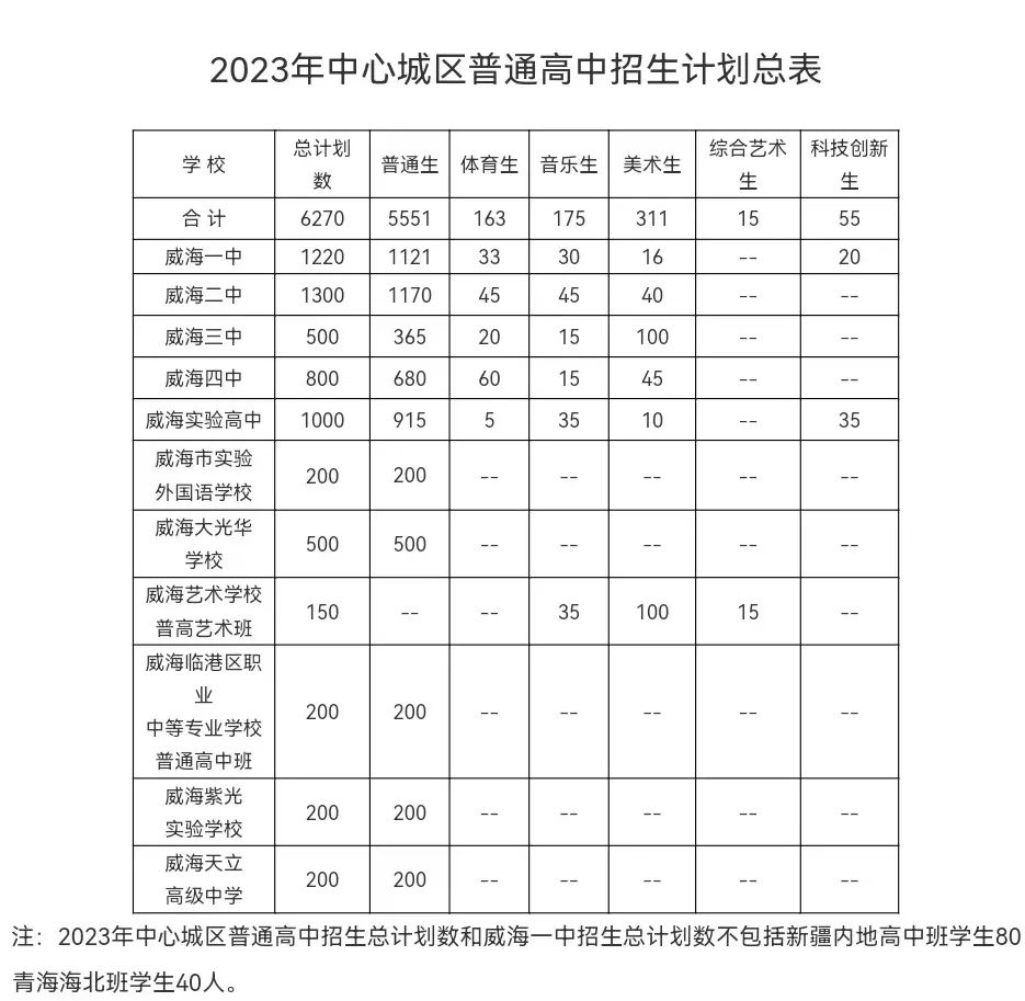 ??????6月15日,市教育局公布2023年中考志愿填報時間表,威海中心城區(qū)普通高中招生計劃總表及特長生招生計劃詳表。根據(jù)安排,2023年中心城區(qū)普通高中計劃招生6270人,6月21日公布中考成績,6月22日至23日市直高中報志愿。