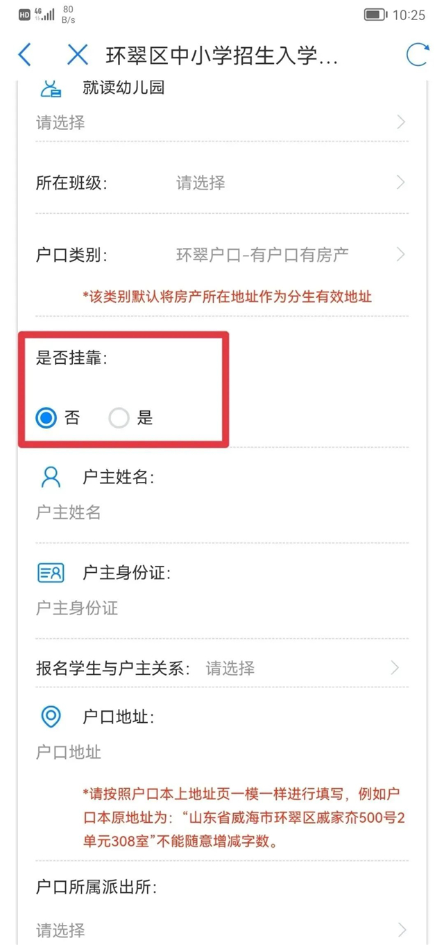 (6)戶口類型:共六種類型,請根據(jù)孩子實(shí)際情況選擇其中一種類型。注:經(jīng)區(qū)公安分局、高區(qū)公安分局、臨港區(qū)公安分局轄區(qū)內(nèi)戶籍選擇“其他—環(huán)翠區(qū)內(nèi)有(無)房產(chǎn)”,文登區(qū)、榮成市、乳山市戶籍選擇“外地戶口—環(huán)翠區(qū)內(nèi)有(無)房產(chǎn)”。