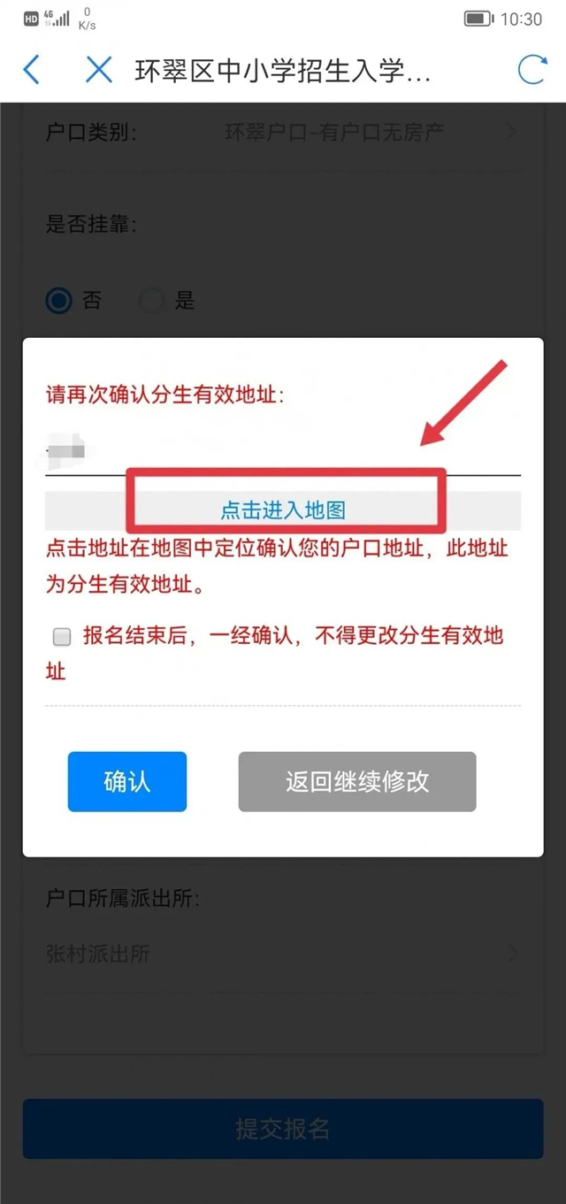 4.點(diǎn)擊提交后,進(jìn)入確認(rèn)分生有效地址界面,點(diǎn)擊進(jìn)入地圖,選好分生有效地址后點(diǎn)擊確認(rèn)。