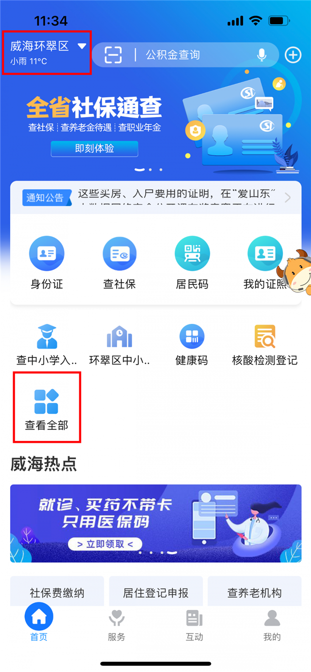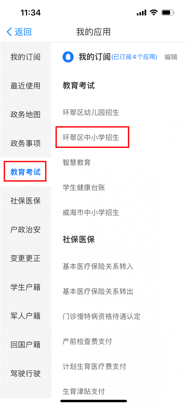 3.登錄“愛山東”APP,首頁左上角切換到威海市環(huán)翠區(qū),在首頁應(yīng)用列表找到“查看全部”,左側(cè)找到“教育考試”欄目,右側(cè)找到“環(huán)翠區(qū)中小學(xué)招生”進(jìn)入。