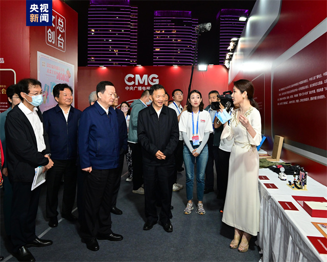 △慎海雄、周乃翔、江成、宋軍繼等觀看中央廣播電視總臺文創產品展示