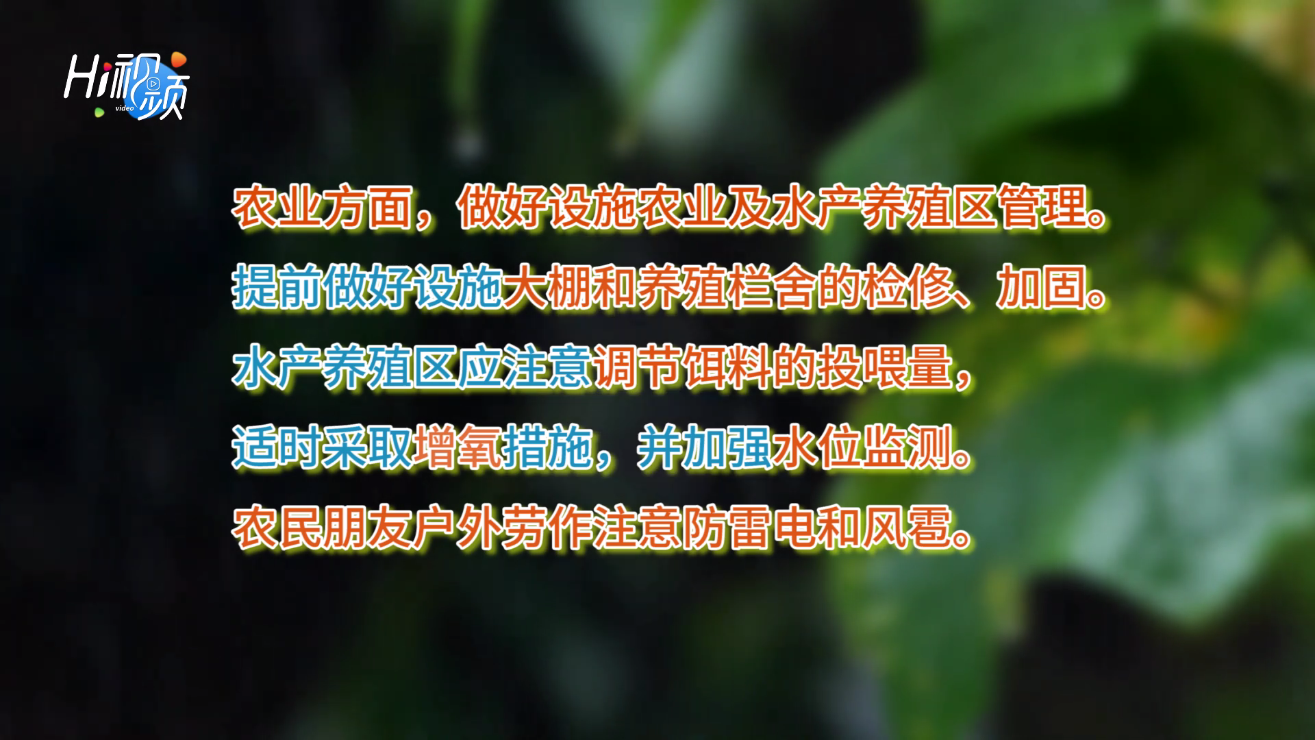 ??????農民朋友戶外勞作注意防雷電和風雹,做好設施農業及水產養殖區管理,提前做好設施大棚和養殖欄舍的檢修、加固。水產養殖區應注意調節餌料的投喂量,適時采取增氧措施,并加強水位監測。