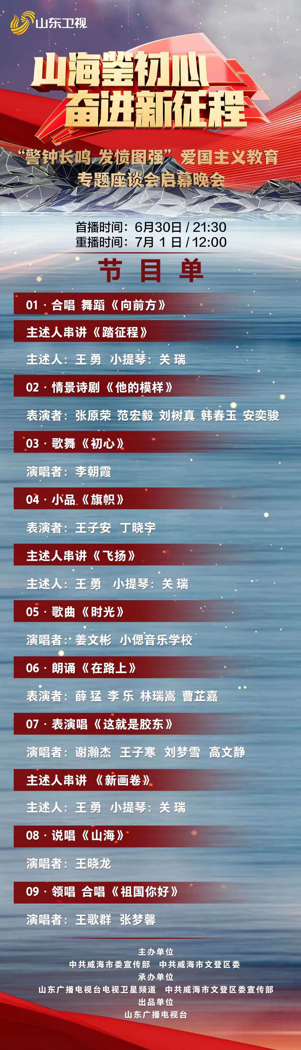 6月30日21:30,山東衛視播出山海鑒初心奮進新征程“警鐘長鳴 發憤圖強”愛國主義教育專題座談會啟幕晚會,節目單來了!