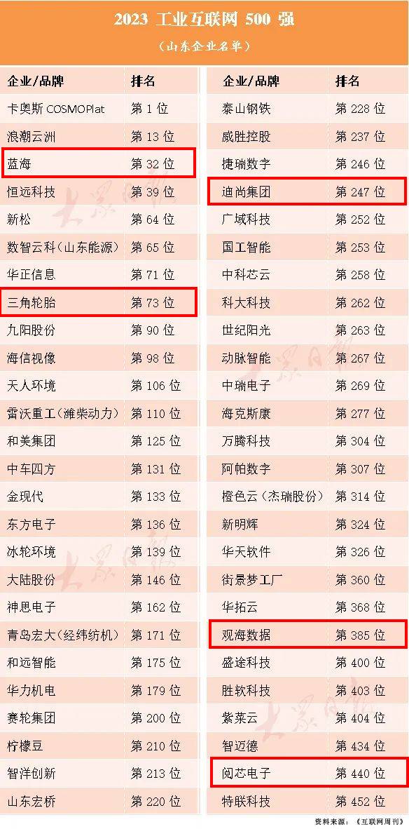 近日,中國(guó)科學(xué)院《互聯(lián)網(wǎng)周刊》聯(lián)合eNET研究院、德本咨詢(xún)發(fā)布了“2023工業(yè)互聯(lián)網(wǎng)500強(qiáng)”,山東共有56家企業(yè)入選,威海5家企業(yè)上榜。