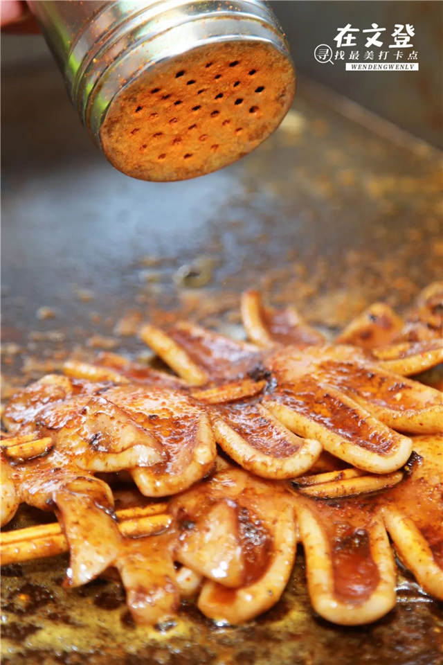 大胡子烤魷魚幾平米的小店,門口總是排著隊,排列整齊的烤腸、烤面筋蓄勢待發,還有一整只的大魷魚讓人垂涎欲滴,在碳火的加持下香味撲鼻,翻面、刷醬、撒料,燒烤師傅一系列操作行云流水。
