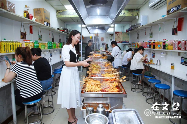 串的吃法有很多,在江南小吃不遠處的再來點炸串店,藏身于繽紛美食街,也是這條街上的“明星店”。
