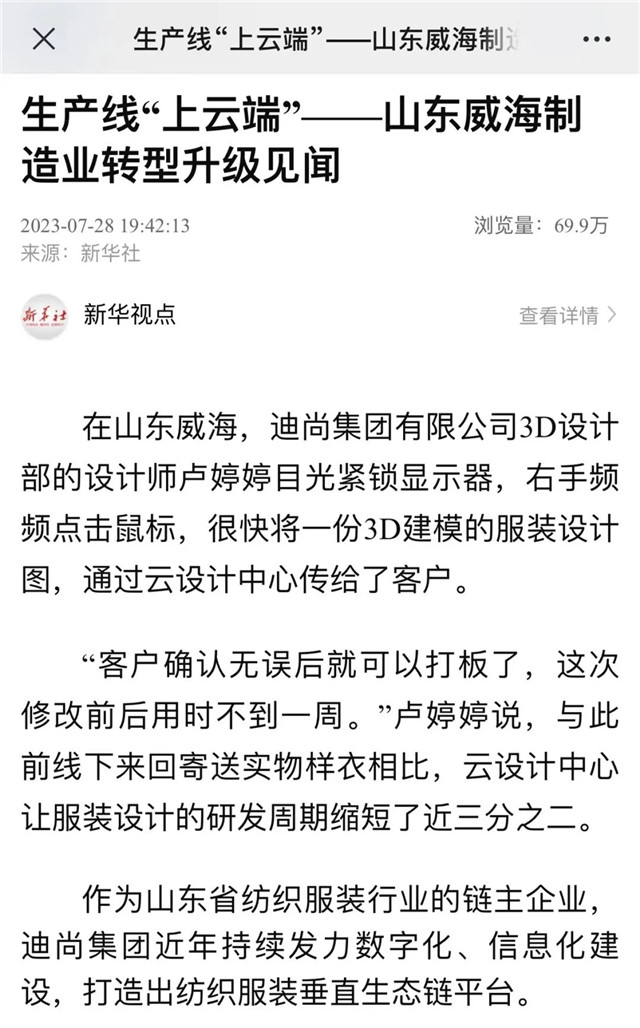 ??????作為山東省紡織服裝行業的鏈主企業,迪尚集團近年持續發力數字化、信息化建設,打造出紡織服裝垂直生態鏈平臺。