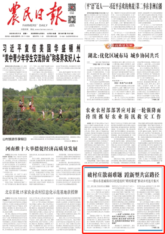 8月21日,《農民日報》頭版刊發《破村莊散弱難題 蹚新型共富路徑》,聚焦威海以村黨組織“跨村聯建”推動鄉村連片振興的經驗做法。以下為報道全文——