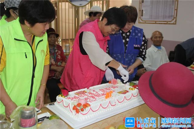 飯吃著正香,又響起了歡快的音樂。志愿者們走到老人身旁,一起合唱《我和我的祖國》。寫著“祝祖國母親生日快樂”字眼的大蛋糕也被搬到老人面前,志愿者們將節日蛋糕端給每一位老人,整個暖心食堂充滿了歡聲笑語。