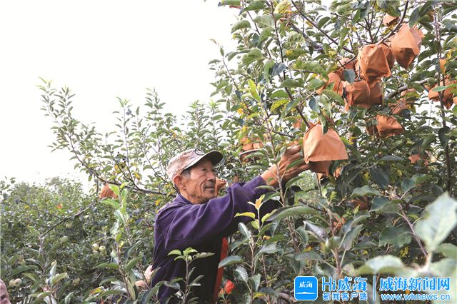 ?西黃山村村民正在果園里為蘋果摘袋