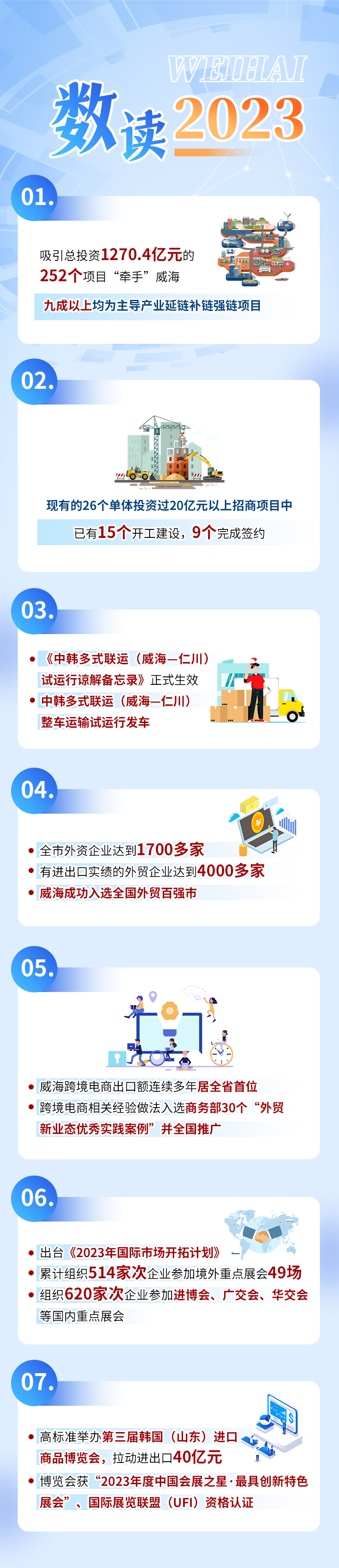 ??????——對外經貿促進活動密集開展,威海(東京)投資環境說明會、比利時投資環境說明會、威海(泉州)食品產業合作懇談會、威海(韓國)投資環境推介會……瞄準重點區域,全市共組織招商活動300余場次,深化與各方合作。