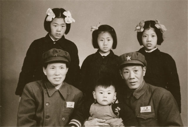 父親梁輯卿、母親王梅欣與女兒梁恒心(前排左一)、梁恒力(前排右一)的合影