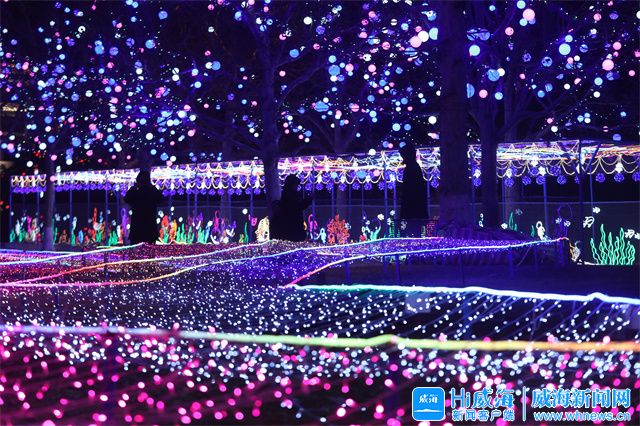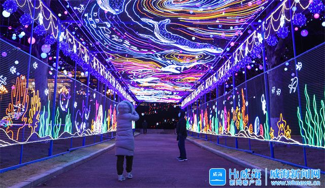 以市人民廣場為例,其燈展設施以“一城山海”為背景底色,展現威海精致形象的同時,尤其注重互動互游。如廣場頂部斜坡旁設置的網紅泡泡燈,對準其吹氣時顏色變換,讓人感到十分夢幻。東西甬道布置了互動海浪全息投影燈,營造沙灘踏浪休閑、浪漫愜意的空間氛圍。“百舸爭流 踔厲奮發”主景觀同樣值得打卡,該景觀融入了燈塔、風帆、船舵等元素,象征著我市各行各業乘風破浪聚力前行。