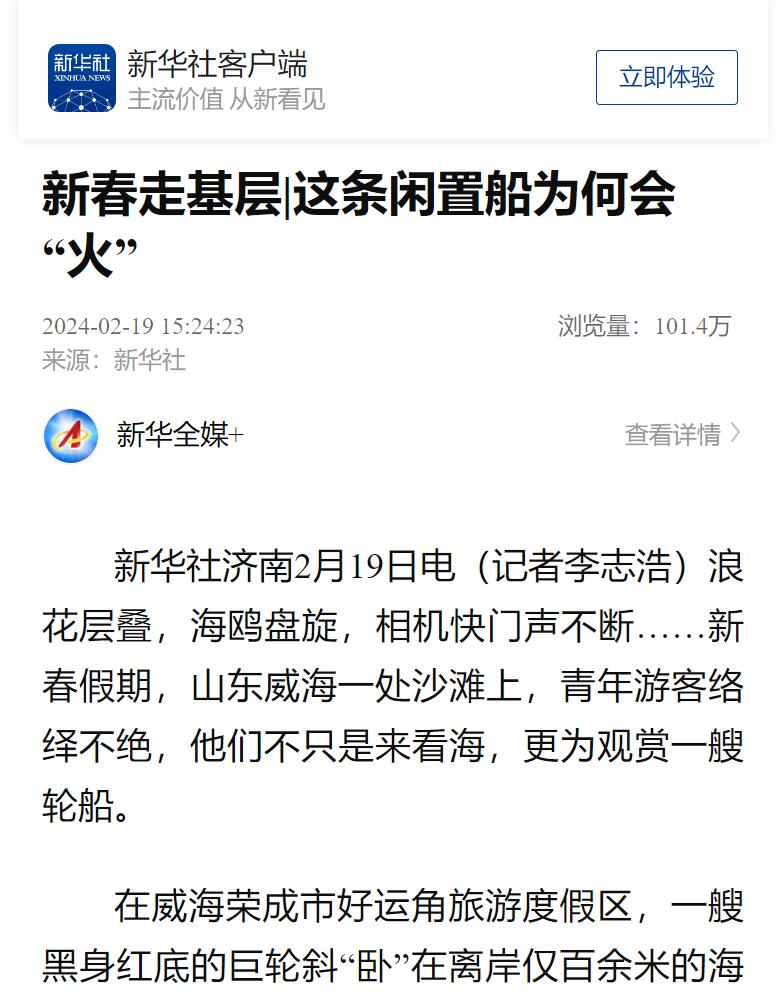??????春節期間,布魯威斯號日均游客上萬人,全網話題量超8億,可謂“熱辣滾燙”,新華社記者也循著這艘巨輪的熱度趕來,2月19日,新華社發文《新春走基層 | 這條閑置船為何會“火”》,截至目前,瀏覽量已過百萬。