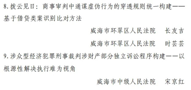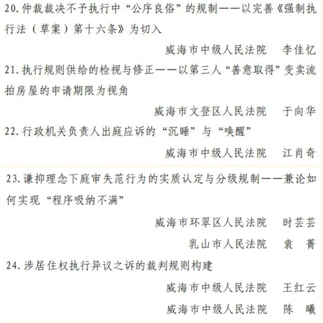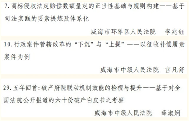 本次評選中,威海法院1篇論文獲評一等獎,2篇論文獲評二等獎,3篇論文獲評三等獎,5篇論文獲評優秀獎,威海市中級人民法院、威海市環翠區人民法院獲評組織工作先進單位。