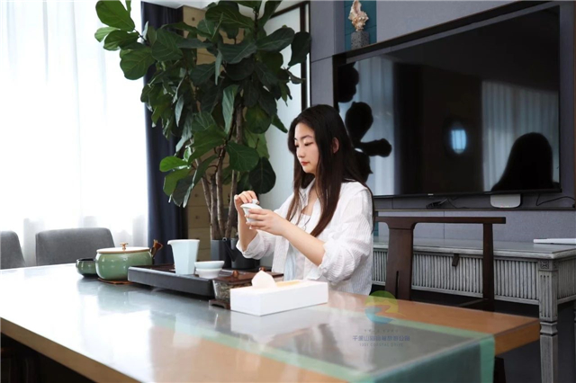 輕輕坐于桌前,抬手煮茶,葉片翻滾舒展的瞬間,茶香四溢,只覺客房里充盈了這春茶的清新,滿室春意。