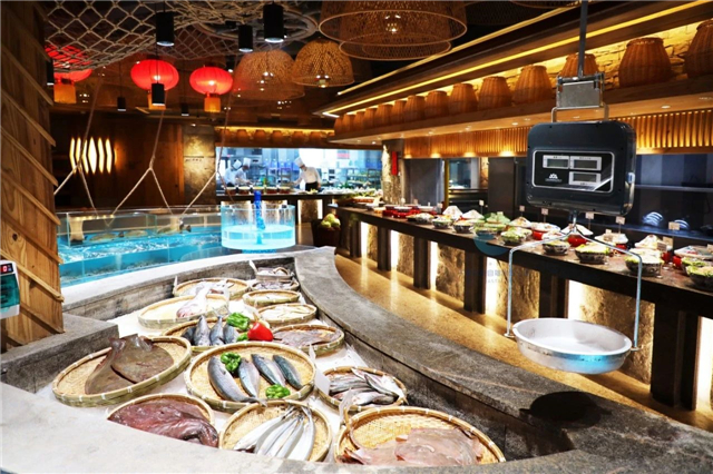 象征著敲響吉祥的漁家大鼓,漁船造型的食材展柜,以漁籠漁網為裝飾的頂棚設計,隨處可見的漁家風情讓人感受到獨特的漁民文化。