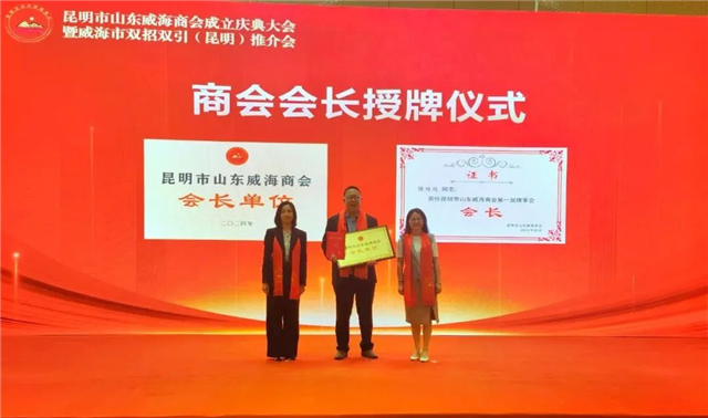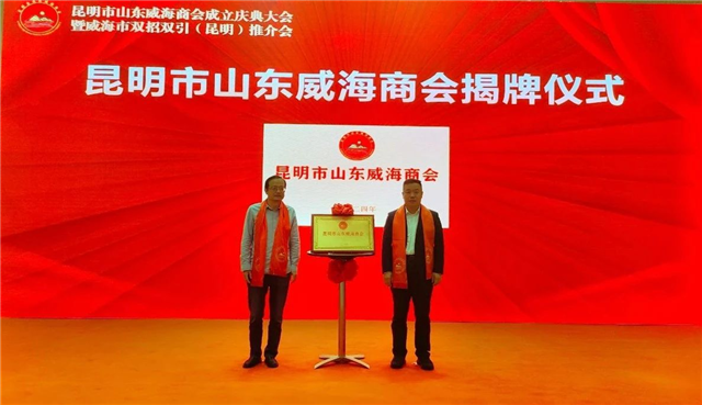 會上,昆明市委統戰部二級巡視員冉德濤和徐其成為商會揭牌,昆明市工商聯黨組成員、副主席,市商協會黨委書記范莉華和威海市工商聯副主席孫杰向商會會長授牌,孫杰向商會頒發“威海市雙招雙引聯絡站”牌匾。