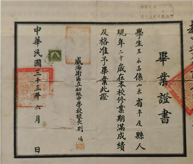 1944年,王海在威海衛區立初級中學的畢業證書。