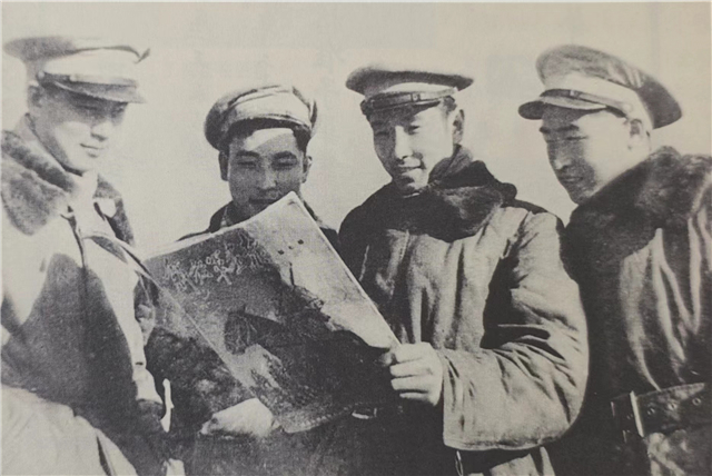 王海(右二)與戰友們閱讀《解放軍畫報》