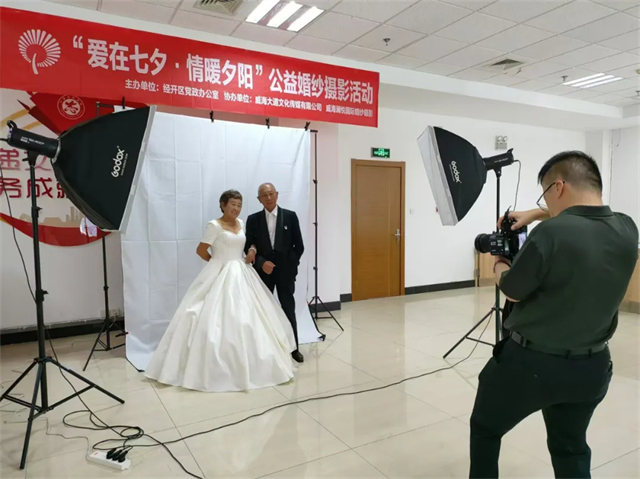經(jīng)區(qū)新時(shí)代文明實(shí)踐中心組織為轄區(qū)60歲及以上的老年夫妻免費(fèi)拍攝婚紗照,幫老人們圓一個(gè)“婚紗夢(mèng)”。伴隨相機(jī)的咔嚓聲,幸福的笑容被定格,見(jiàn)證著老人們相伴一生、患難與共的“不老”愛(ài)情。