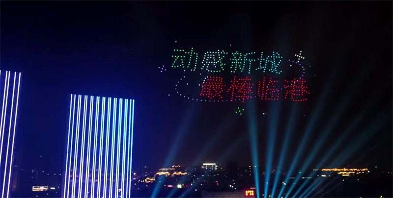 晚會錄制現場,2000余名來自威海臨港的群眾還見證了一場精彩的無人機表演,威海公園燈塔、環翠樓、林泉河橋等威海地標閃耀夜空。