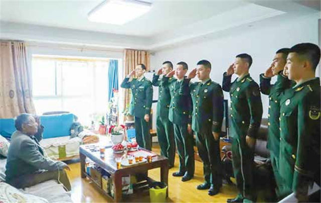 武警工程大學師生向欒紹本敬禮,老兵右手傷殘,左手回禮。