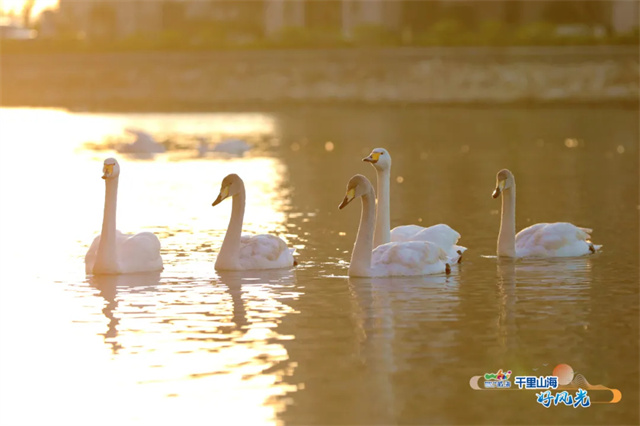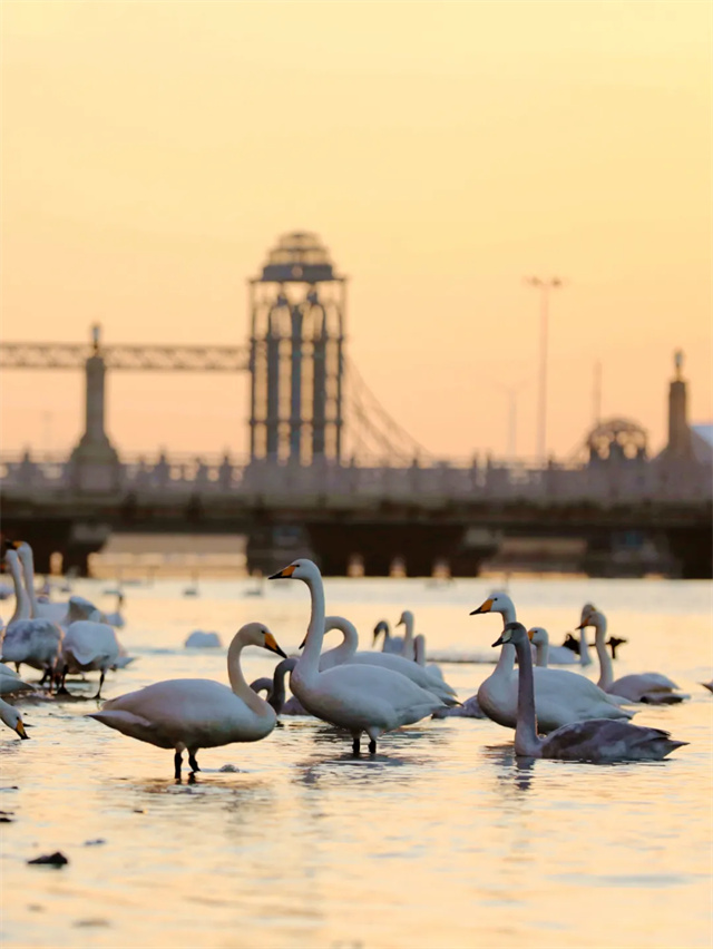 每到拂曉時分,順著曦光撥開晨霧,湖面上已然“熱鬧”了起來,數不清的大天鵝振翅飛來,高歌著來自西伯利亞的浪漫旋律,在瀲滟湖色之上優哉游哉行,起舞弄清影,婀娜的身姿與水光相依相映。