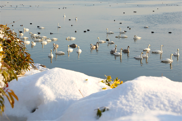 天鵝作為象征“忠貞”的愛情鳥,一直備受人們的喜愛。在威海,你可以看到這些遠道而來的客人在一池冬水中引頸高歌、翩然飛舞。“萬頃湖天碧,一池雪花白。”眾多身姿優(yōu)美的天鵝棲息湖上,宛若一湖白雪,點綴在清澈潔凈的水面上。