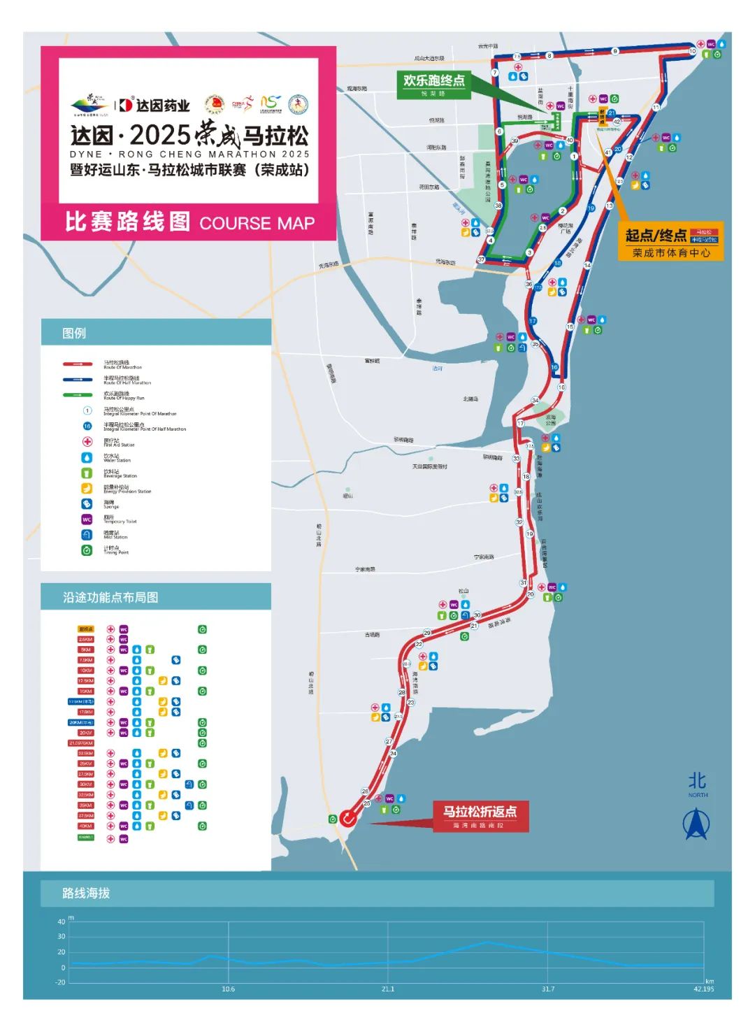 ????????1.全程馬拉松(42.195公里):榮成市體育中心(起點)→悅湖路(由東往西)→櫻花湖體育公園(北門入口)→櫻花湖環湖路(順時針由北往南)→櫻花湖體育公園(西門出口)→云光中路(由南往北)→成山大道東段(由西往東)→成山大道榮成博物館附近折返→海灣北路(由北往南)→濱海公園北門(入口)→濱海公園綠道(由北往南)→濱海公園南門(出口)→斜口島大橋→海灣南路(由北往南)→濱海公園(南拓入口)→濱海公園綠道(由北往南)→濱海公園(南拓出口)→海灣南路(由北往南)→海灣南路折返點(近G228國道)→海灣南路(由南往北)→斜口島大橋→海灣南路(由南往北)→櫻花湖體育公園(南門入口)→櫻花湖環湖路(順時針由南往北)→櫻花湖體育公園(少年宮出口)→海灣北路(由南往北)→悅湖路(由東往西)→榮成市體育中心(終點)。