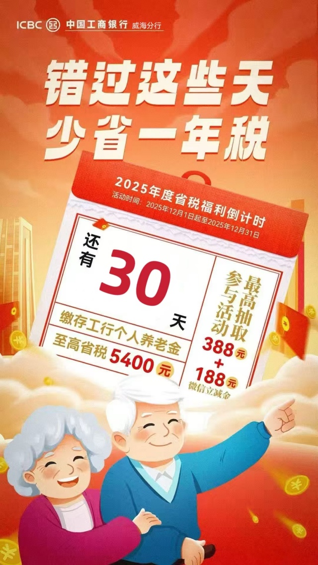 ????????年度稅優截止倒計時僅剩最后30天!2025年12月31日前,在中國工商銀行威海分行開通并繳存個人養老金,即可尊享兩大權益: