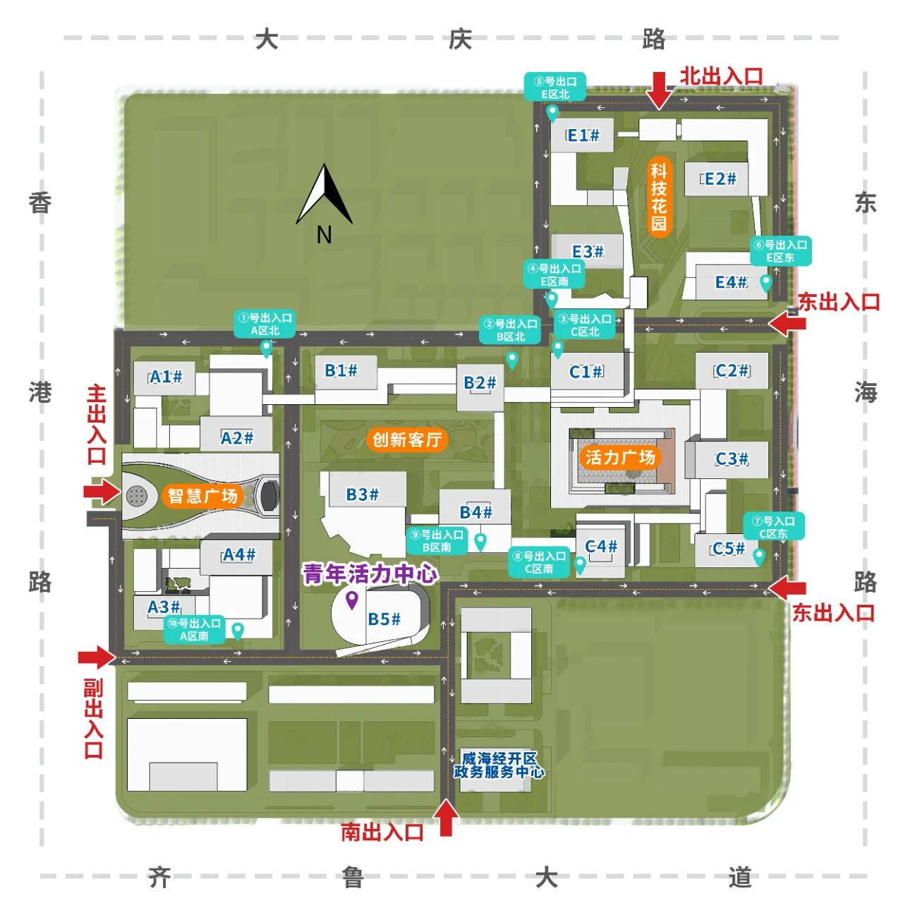 ????????自駕出行:導(dǎo)航“智慧谷T16藝文活力街區(qū)”即可到達(dá)活動場地。智慧谷服務(wù)貿(mào)易產(chǎn)業(yè)園共有6個停車場入口,分布在香港路、大慶路、東海路、齊魯大道4條主干道上,市民可就近選擇合適的入口前往活動場地。