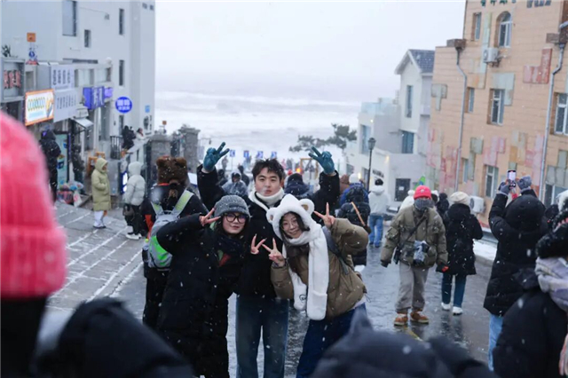 ? 除了這些“有備而來”的游客,不少人還收獲了意外之喜。來自廣東的鄒琳琳原本計劃昨天就結束旅行,踏上返程的列車,前一晚聽說今日有雪,她當即決定改簽,延遲行程。“活了30多年,這是我第一次見這么大的雪!”站在幸福門廣場上,鄒琳琳仰頭望著漫天飛舞的雪花,忍不住感嘆“威海真的好靚哦!”她特意將威海的最后一站定在幸福門,不僅看了雪后海濱的景色,還體驗了喂海鷗的樂趣,潔白的海鷗在雪中盤旋,被她永遠定格在相機里。