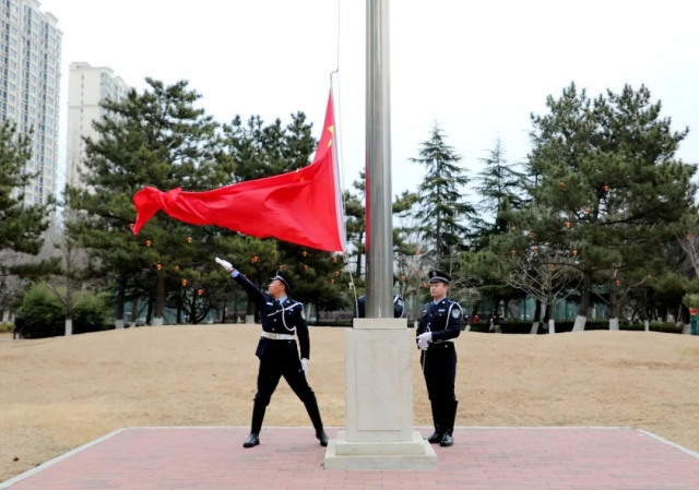 早上8時20分,新春升旗儀式正式開始。伴隨著雄壯激昂的國歌,鮮艷的五星紅旗迎著朝陽緩緩升起,在新年的春風里飄揚,全場人員向國旗行注目禮。