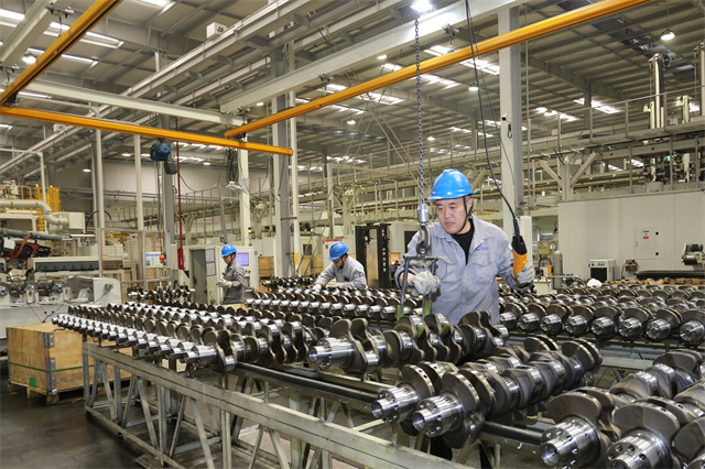 ????????在天潤工業曲軸智能制造事業部生產車間內,工人正檢驗產品。