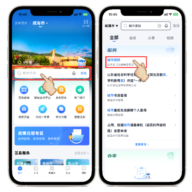 2.完成賬號(hào)注冊(cè)后,進(jìn)入“愛山東”App,在首頁上方搜索欄輸入關(guān)鍵詞“城市獎(jiǎng)扶”,點(diǎn)擊進(jìn)入該服務(wù)。
