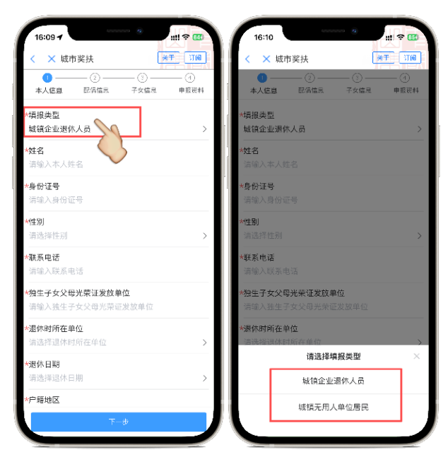 4.填寫“本人信息”。根據(jù)個(gè)人情況選擇填報(bào)類型,并按要求如實(shí)填寫各項(xiàng)信息,填寫完成點(diǎn)擊“下一步”。