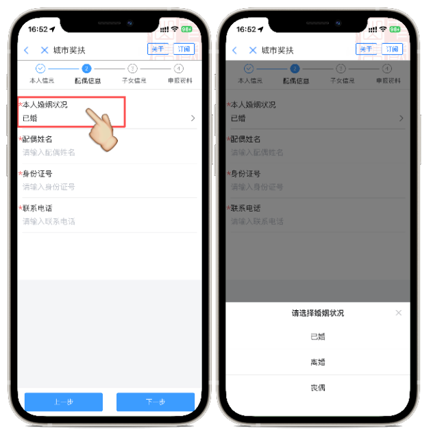 5.填寫“配偶信息”。根據(jù)個(gè)人情況選擇本人婚姻狀況,并按要求如實(shí)填寫各項(xiàng)信息,填寫完成點(diǎn)擊“下一步”。